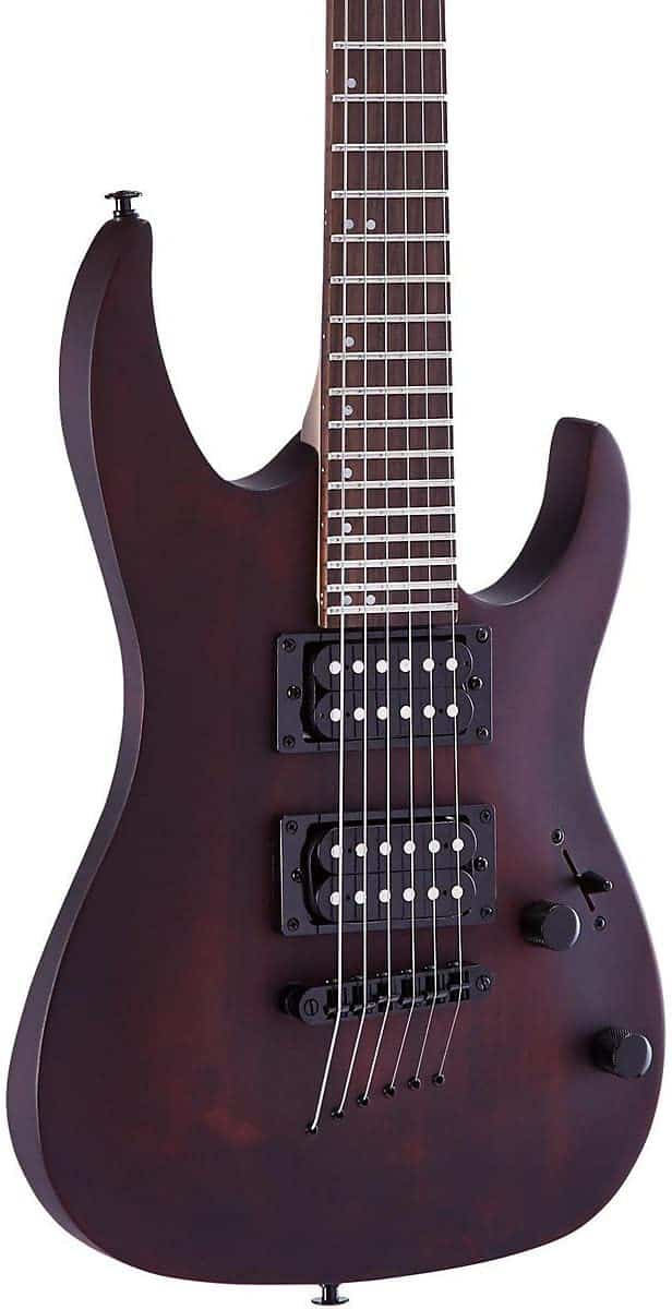 - Body: The MM100’s body is made of basswood, which is a very common tonewood to use for budget instruments. As a tonewood, basswood has nicely balanced harmonics with a boosted midrange and good dynamic response. The product specs list the body’s finish as gloss, but that’s only true for the black and red finish options; the “walnut stain” finish is very attractive and has a matte finish with stained woodgrain showing through. The body shape is Strat-esque, but the horns are sharper, the body contour is wider at its middlemost point, and the upper horn appears to reach further and higher than a Strat body’s does. There is a nice strum arm contour on the top of the body, making it quite comfortable to play, and the bottom cutaway is large and allows clear access to all 24 frets.