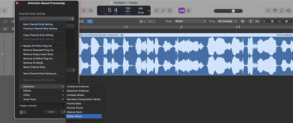 Selection-Based Processing allows you to add effects to a portion of the audio on the track. In my case, I need to "soften the attack" to round out the peaks that got cut off. Fortunately, in the dropdown menu, under the Channel Strip Settings, there are four categories at the bottom. Dynamics, Effects, Utilities, and Vocal Tools. Choose Dynamics and select "Soften Attack." This took care of that problem.